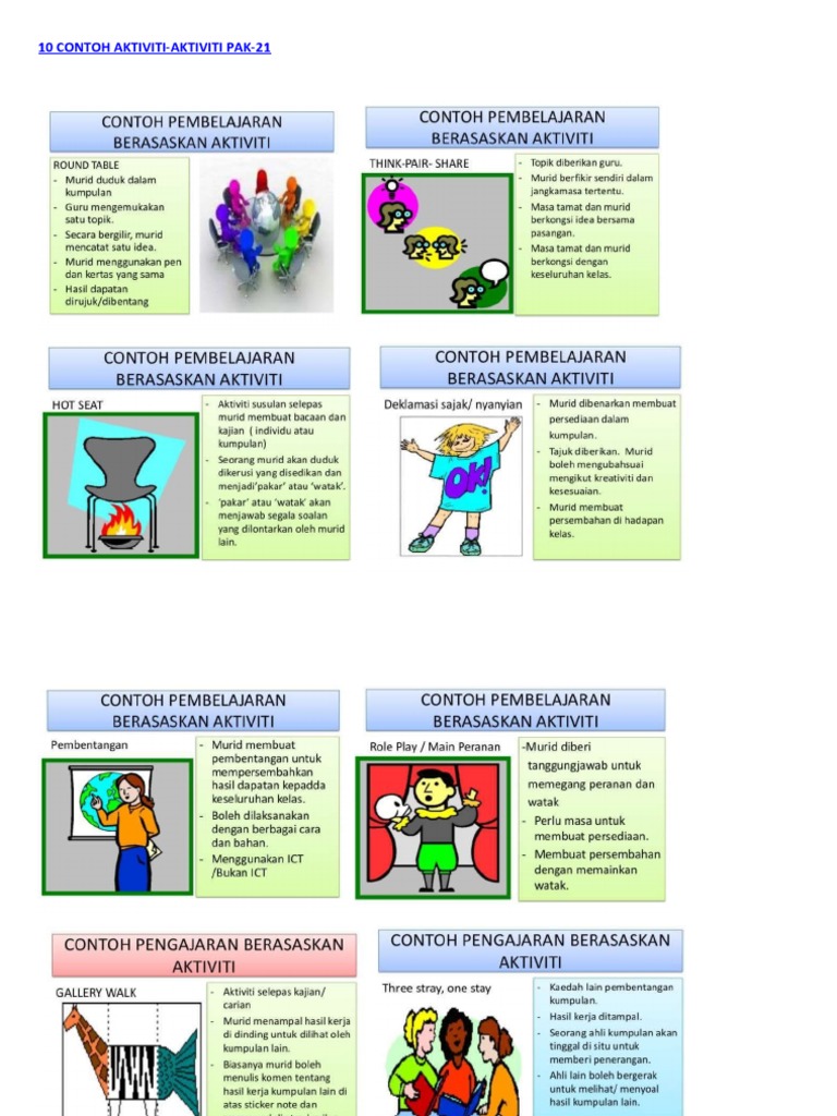 Berikut merupakan 47 aktiviti Pembelajaran Abad ke-21 PAK-21 yang telah saya sediakan dalam bentuk grafik iaitu gambar bersaiz A4 format PNG yang mempunyai resolusi kualiti tinggi 4490 x 3175. Murid duduk dalam kumpulan dan guru mengemukakan satu topik. Pembelajaran Abad Ke 21 PA21.